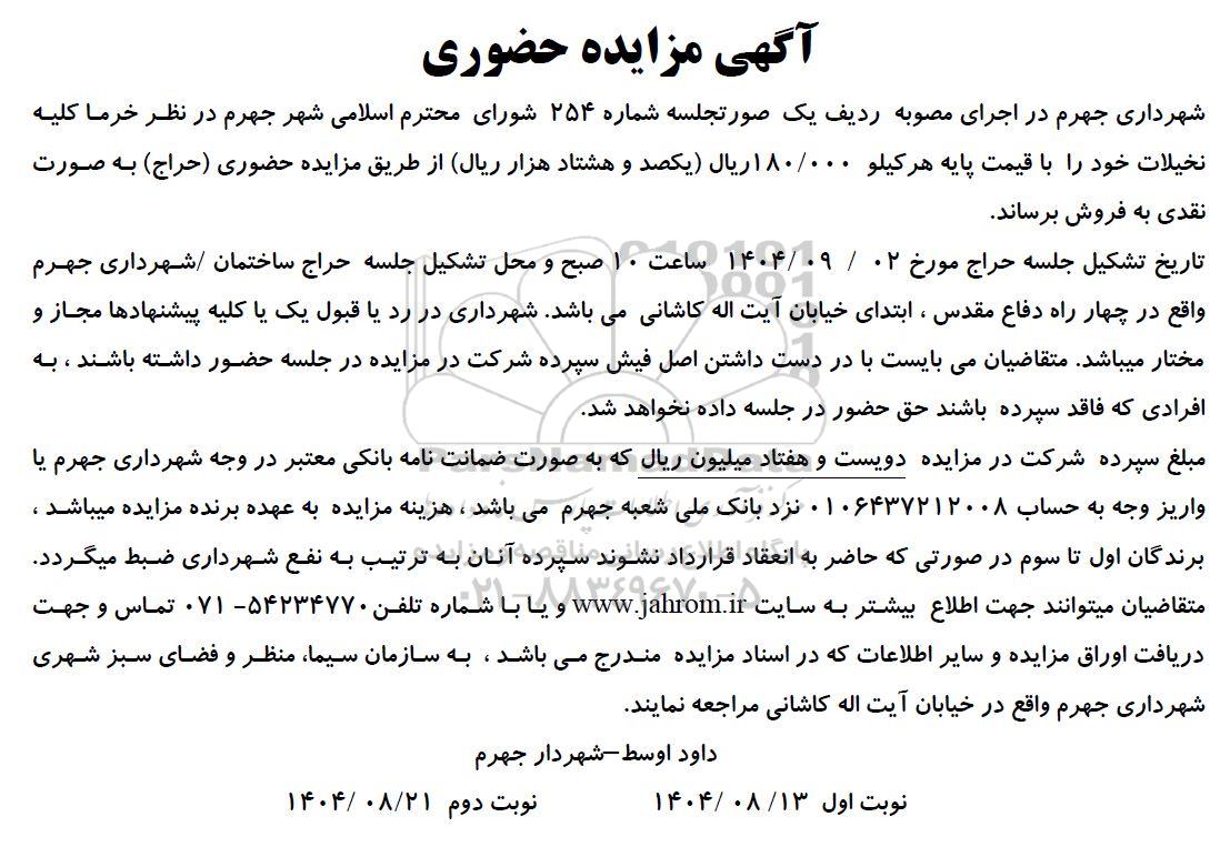 شهرداری جهرم در اجرای مصوبه ردیف یک صورتجلسه شماره 254 شورای محترم اسلامی شهر جهرم در نظر خرما کلیه نخیلات خود را با قیمت پایه هر کیلو 180.000 ریال یکصد و هشتاد هزار ریال از طریق مزایده حضوری (حراج) به صورت نقدی به فروش برساند.