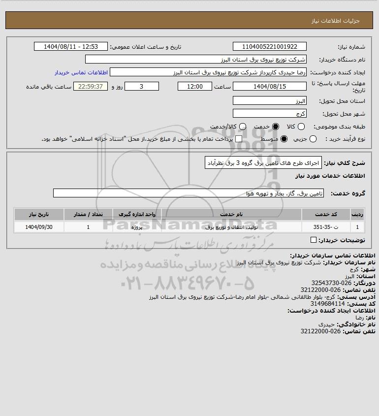 شرح کلی نیاز: اجرای طرح های تامین برق گروه 3 برق نظرآباد