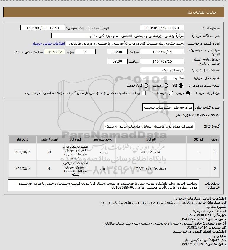 شرح کلی نیاز: هارد -رم طبق مشخصات پیوست