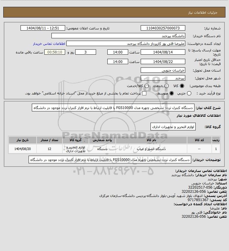 شرح کلی نیاز: دستگاه کنترل تردد تشخصی چهره مدل FGS10000 با قابلیت ارتباط با نرم افزار کنترل تردد موجود در دانشگاه
