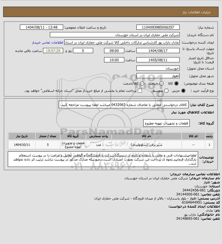 شرح کلی نیاز: کالای درخواستی مطابق با تقاضای شماره 0432063 میباشد لطفا بپیوست مراجعه کنید.
