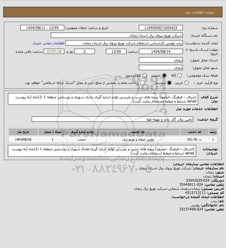 توضیحات خریدار:(اشراق – فرهنگ –ایجرود) پروژه های تست و بازرسی لوازم اندازه گیری عادی شهری و روستایی منطقه 1 -12ماه (به پیوست sanad شرایط و ضوابط استعلام رعایت گردد)