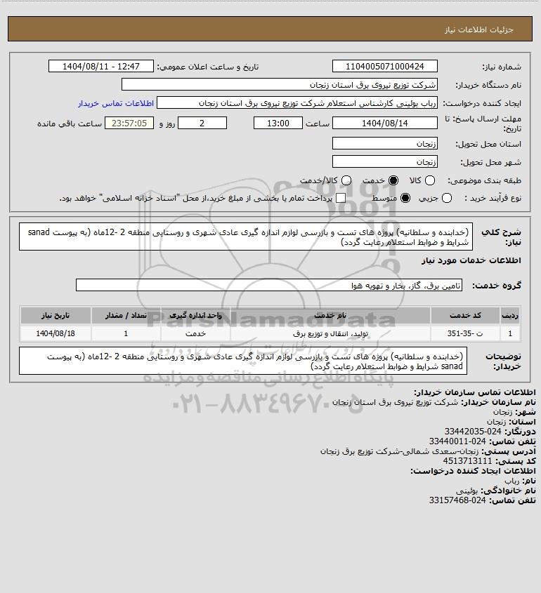 شرح کلی نیاز: (خدابنده و سلطانیه) پروژه های تست و بازرسی لوازم اندازه گیری عادی شهری و روستایی منطقه 2 -12ماه (به پیوست sanad شرایط و ضوابط استعلام رعایت گردد)