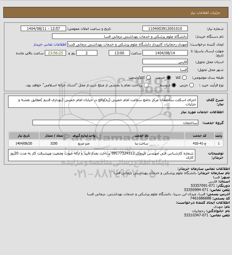 استعلام بها و موضوع استعلام استعلام اجرای اسکلت ساختمان مرکز جامع سلامت امام خمینی (ره)واقع در خیابان امام خمینی (بهداری قدیم )مطابق نقشه و جزئیات به اطلاع کلیه شرکت‌ها و افراد متخصص واجد شرایط می‌رساند، آگهی گذار در نظر دارد از طریق استعلام بها، نسبت به انتخاب و دریافت پیشنهادات اقدام نماید. این استعلام با کد آگهی ثبت شده در سامانه خبرگزاری پارس نماد : 9787501 منتشر شده است. مشخصات استعلام : تاریخ شروع استعلام: 1404/08/11 آخرین مهلت ارسال پیشنهاد قیمت : 1404/08/14 و محل اجرای پروژه : استان فارس میباشد. استعلام قیمت مورد درخواست : استعلام اجرای اسکلت ساختمان مرکز جامع سلامت امام خمینی (ره)واقع در خیابان امام خمینی (بهداری قدیم )مطابق نقشه و جزئیات با دسته‌بندی‌های تخصصی و گروه های مرتبط : سازه های فلزی و فضایی, ساختمان, استعلام اطلاع رسانی میگردد.