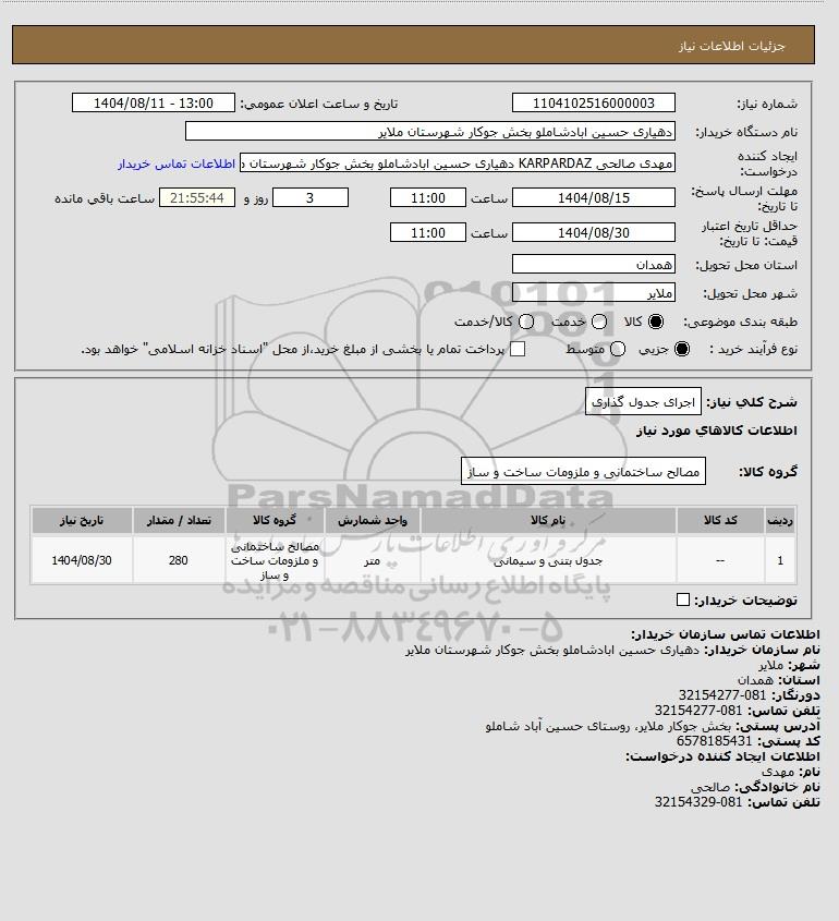 استعلام بها و موضوع استعلام استعلام اجرای جدول گذاری به اطلاع کلیه شرکتها و افراد متخصص واجد شرایط میرساند، آگهی گذار در نظر دارد از طریق استعلام بها، نسبت به انتخاب و دریافت پیشنهادات اقدام نماید. این استعلام با کد آگهی ثبت شده در سامانه خبرگزاری پارس نماد : 9787535 منتشر شده است. مشخصات استعلام : تاریخ شروع استعلام: 1404/08/11 آخرین مهلت ارسال پیشنهاد قیمت : 1404/08/15 و محل اجرای پروژه : استان همدان میباشد. استعلام قیمت مورد درخواست : استعلام اجرای جدول گذاری با دستهبندیهای تخصصی و گروه های مرتبط : محوطه سازی ، جدول گذاری و پیاده رو سازی, ساختمان, استعلام اطلاع رسانی میگردد.