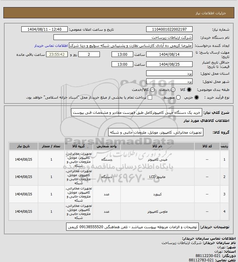 | 3 | -- | کیبورد | عدد | تجهیزات مخابراتی، کامپیوتر، موبایل، ملزومات جانبی و شبکه | 1 | 1404/08/25 |