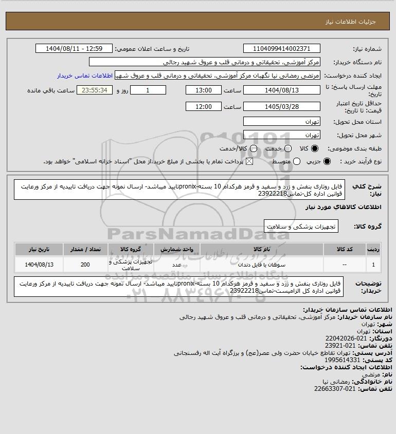 | 1 | -- | سوهان یا فایل دندان | عدد | تجهیزات پزشکی و سلامت | 200 | 1404/08/13 |