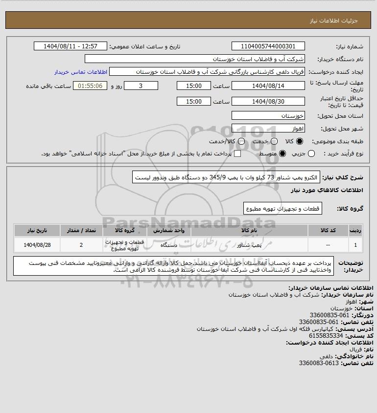 شرح کلی نیاز: الکترو پمپ شناور 73 کیلو وات با پمپ 345/9 دو دستگاه طبق وندوور لیست
