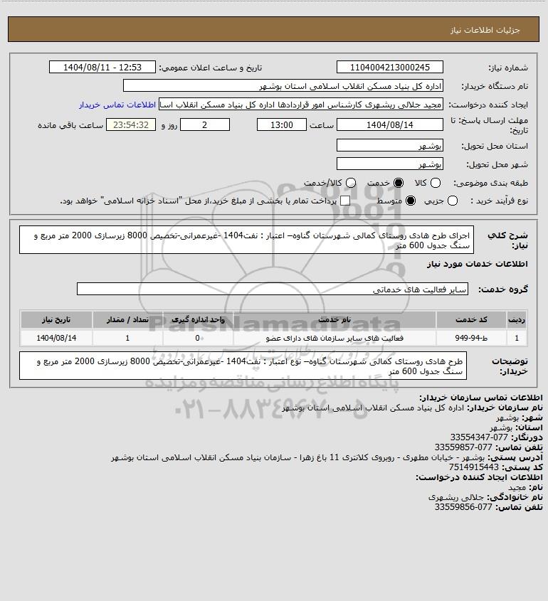 شرح کلی نیاز: اجرای طرح هادی روستای کمالی شهرستان گناوه– اعتبار : نفت1404 -غیرعمرانی-تخصیص 8000 زیرسازی 2000 متر مربع و سنگ جدول 600 متر