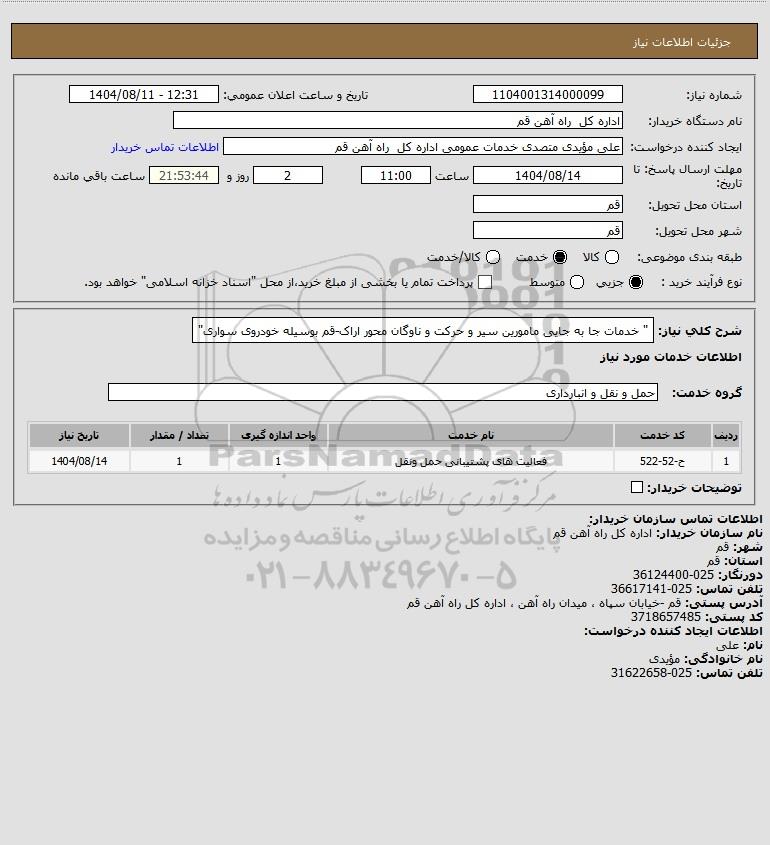 شرح کلی نیاز: " خدمات جا به جایی مامورین سیر و حرکت و ناوگان محور اراک-قم بوسیله خودروی سواری"
