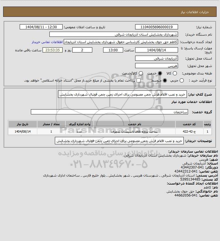 شرح کلی نیاز: خرید و نصب اقلام فرش چمن مصنوعی برای اجرای زمین چمن فوتبال شهرداری بخشایش