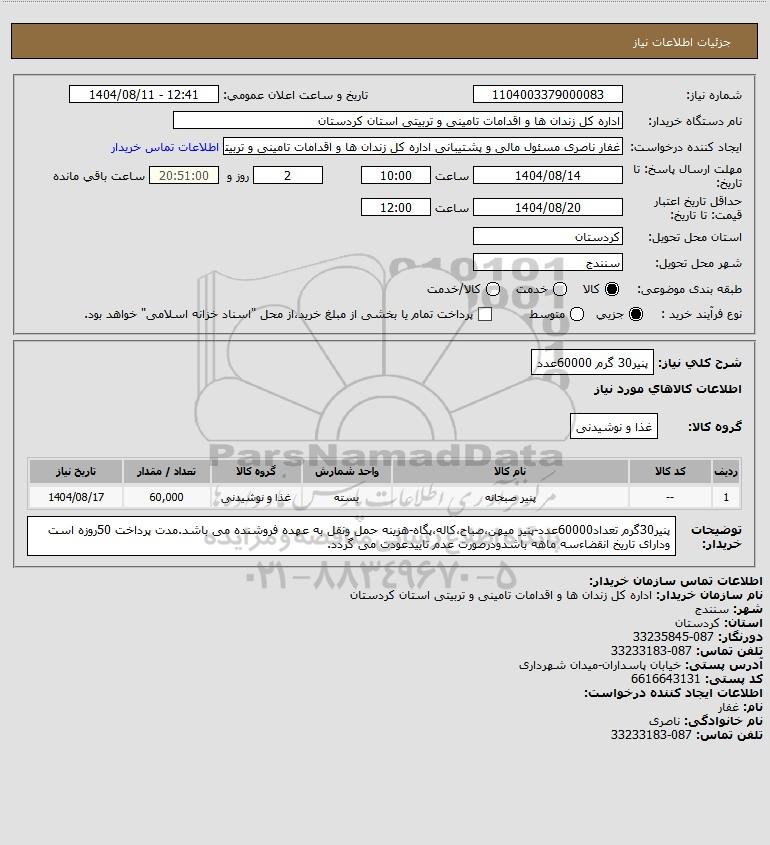 شرح کلی نیاز: پنیر30 گرم 60000عدد