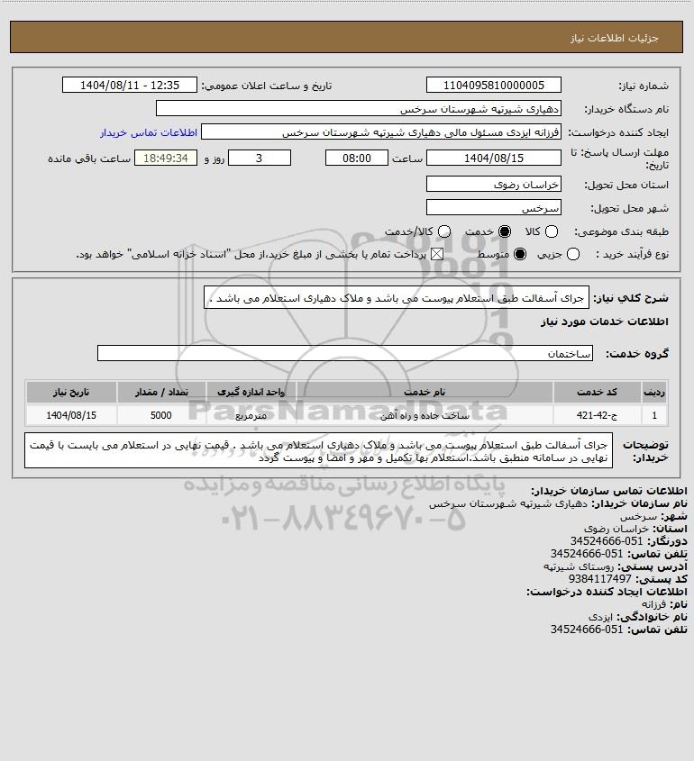 شرح کلی نیاز: جرای آسفالت طبق استعلام پیوست می باشد و ملاک دهیاری استعلام می باشد .