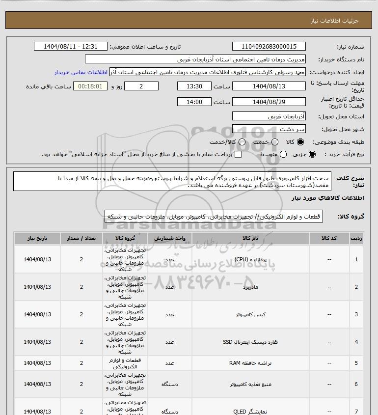 شرح کلی نیاز: سخت افزار کامپیوتری طبق فایل پیوستی برگه استعلام و شرایط پیوستی-هزبنه حمل و نقل و بیمه کالا از مبدا تا مقصد(شهرستان سردشت) بر عهده فروشنده می باشد.