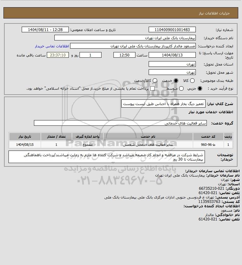شرح کلی نیاز: تعمیر دیگ بخار همراه با اجناس طبق لیست پیوست