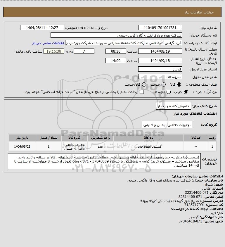 | 1 | -- | کپسول اطفاء حریق | عدد | تجهیزات دفاعی، ایمنی و امنیتی | 1 | 1404/08/28 |
