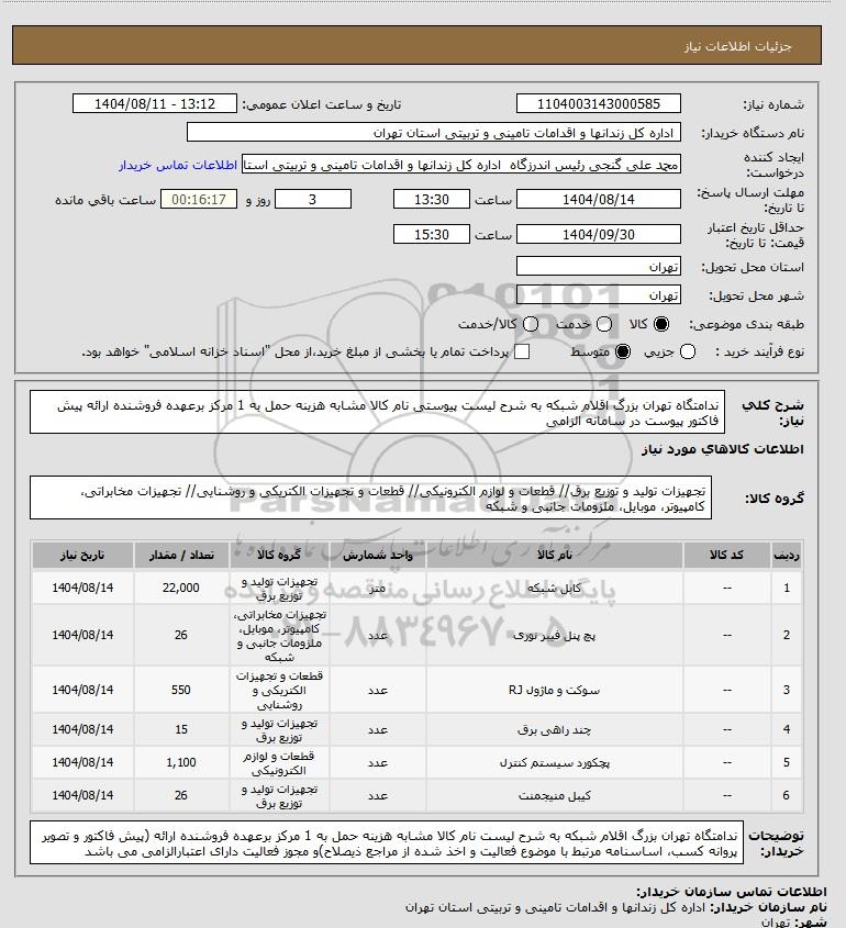 شرح کلی نیاز: ندامتگاه تهران بزرگ اقلام شبکه به شرح لیست پیوستی نام کالا مشابه هزینه حمل به 1 مرکز برعهده فروشنده ارائه پیش فاکتور پیوست در سامانه الزامی