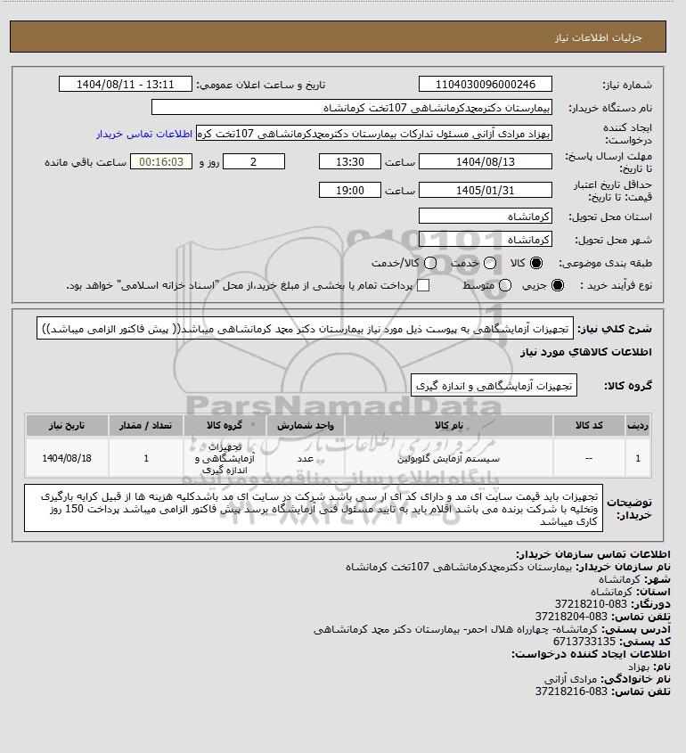 استعلام بها و موضوع استعلام استعلام تجهیزات آزمایشگاهی به پیوست ذیل مورد نیاز بیمارستان دکتر محمد کرمانشاهی میباشد(( پیش فاکتور الزامی میباشد)) به اطلاع کلیه شرکتها و افراد متخصص واجد شرایط میرساند، آگهی گذار در نظر دارد از طریق استعلام بها، نسبت به انتخاب و دریافت پیشنهادات اقدام نماید. این استعلام با کد آگهی ثبت شده در سامانه خبرگزاری پارس نماد : 9787716 منتشر شده است. مشخصات استعلام : تاریخ شروع استعلام: 1404/08/11 آخرین مهلت ارسال پیشنهاد قیمت : 1404/08/13 و محل اجرای پروژه : استان کرمانشاه میباشد. استعلام قیمت مورد درخواست : استعلام تجهیزات آزمایشگاهی به پیوست ذیل مورد نیاز بیمارستان دکتر محمد کرمانشاهی میباشد(( پیش فاکتور الزامی میباشد)) با دستهبندیهای تخصصی و گروه های مرتبط : خدمات و تجهیزات آزمایشگاهی و پزشکی, استعلام اطلاع رسانی میگردد.