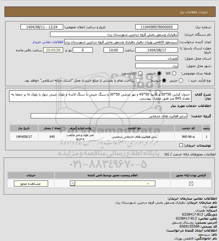 شرح کلی نیاز: جدول کتابی 50*30 و کانیوا 50*40 و نهر عرضی 50*30 و سنگ چینی با سنگ لاشه و بلوک چینی دیوار با بلوک ته پر جمعا به مقدار 845 متر طبق مدارک پیوستی