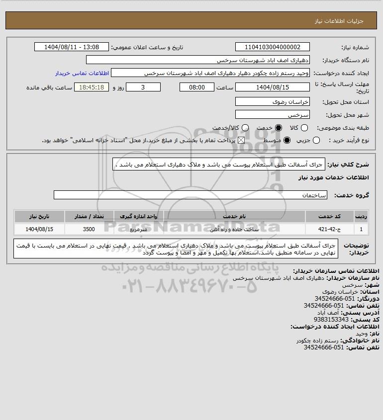شرح کلی نیاز: جرای آسفالت طبق استعلام پیوست می باشد و ملاک دهیاری استعلام می باشد .