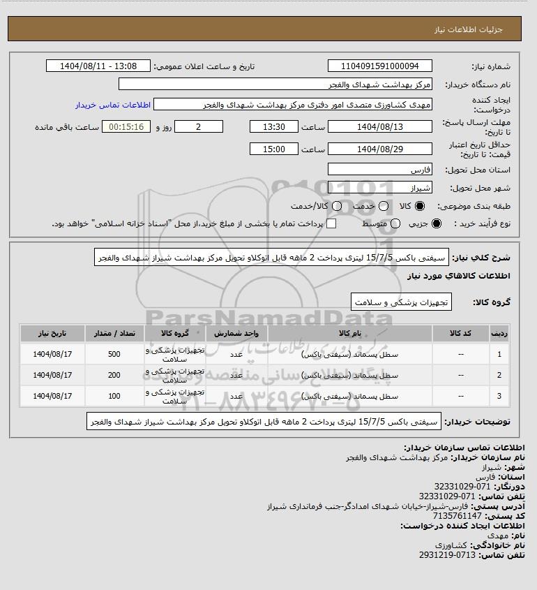 شرح کلی نیاز: سیفتی باکس 15/7/5 لیتری پرداخت 2 ماهه قابل اتوکلاو تحویل مرکز بهداشت شیراز شهدای والفجر