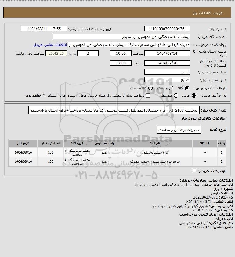 شرح کلی نیاز: دروشیت 100کارتن و کاور جسد100عدد طبق لیست پیوستی کد کالا مشابه پرداخت 4ماهه ارسال با فروشنده