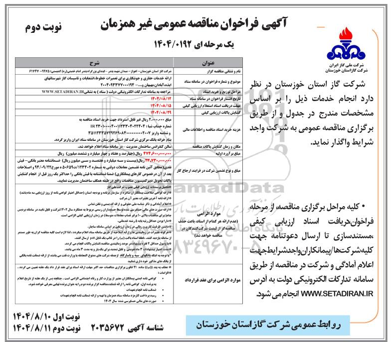 موضوع و شماره فراخوان در سامانه ستاد : ارائه خدمات حفاری و جوشکاری برای تعمیرات خطوط، انشعابات و تاسیسات گاز شهرستانهای ایذه، آبادان، بهبهان و... - 2004093377000194