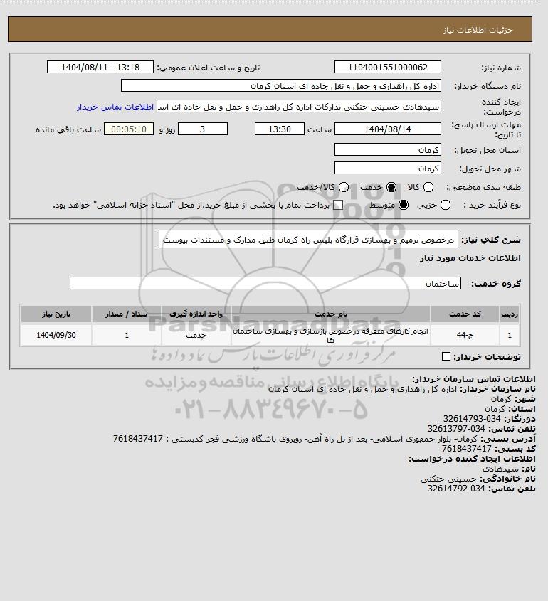 شرح کلی نیاز: درخصوص ترمیم و بهسازی قرارگاه پلیس راه کرمان طبق مدارک و مستندات پیوست