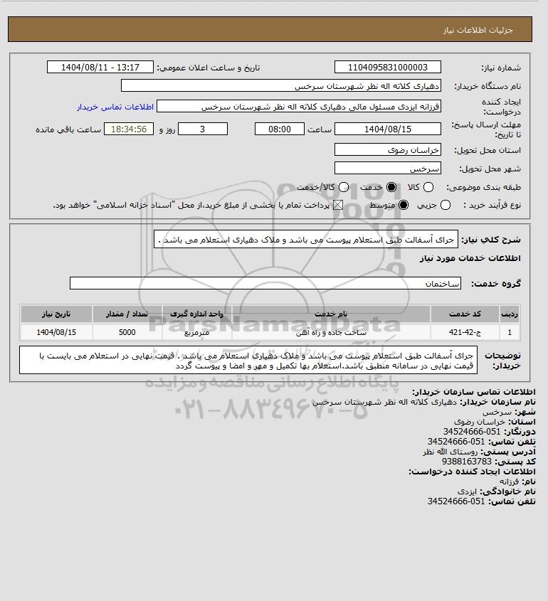 شرح کلی نیاز: جرای آسفالت طبق استعلام پیوست می باشد و ملاک دهیاری استعلام می باشد .