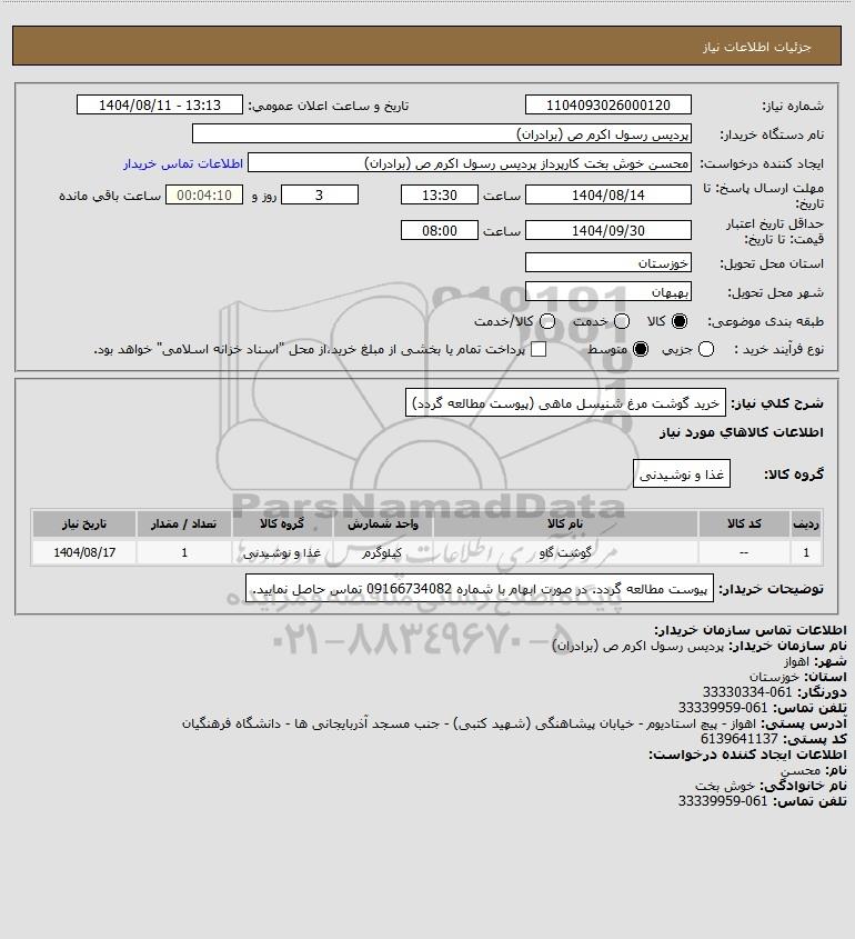 شرح کلی نیاز: خرید گوشت مرغ شنیسل ماهی (پیوست مطالعه گردد)