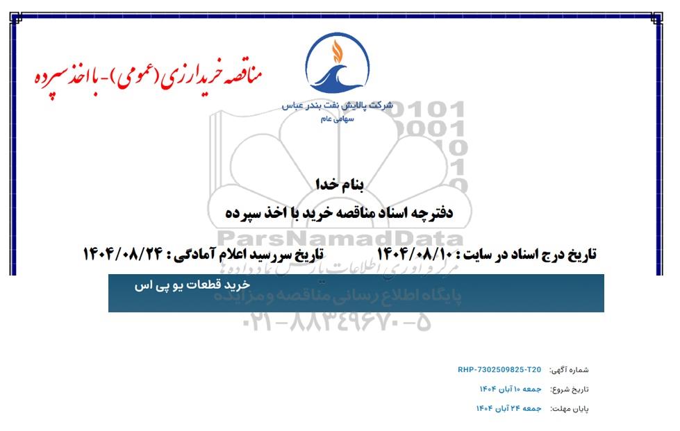 مناقصه خرید قطعات یو پی اس از کلیه افراد متخصص و شرکتها واجد شرایط دعوت به عمل میآید در مناقصه با کد خبرگزاری پارس نماد: 9787874 شرکت نمایند.