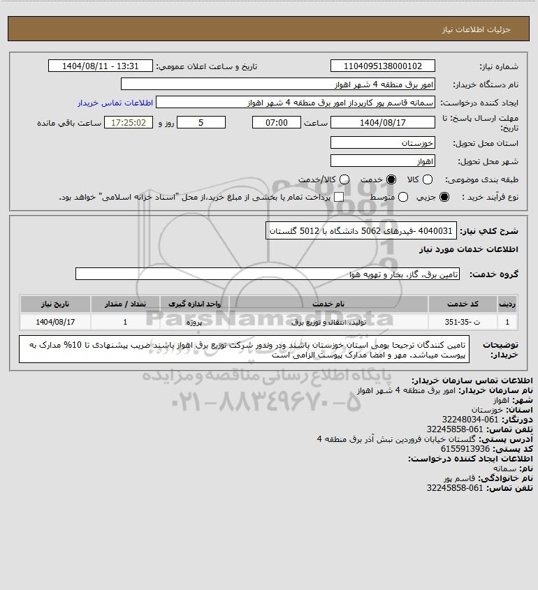 استعلام 4040031 -فیدرهای 5062 دانشگاه با 5012 گلستان, استعلام 4040031 -فیدرهای 5062 دانشگاه با 5012 گلستان