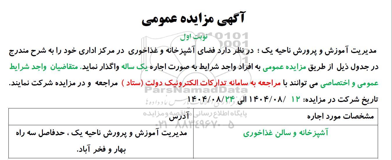 مدیریت آموزش و پرورش ناحیه یک در نظر دارد فضای آشپزخانه و غذاخوری در مرکز اداری خود را به شرح مندرج در جدول ذیل از طریق مزایده عمومی به افراد واجد شرایط به صورت اجاره یک ساله واگذار نماید. متقاضیان واجد شرایط عمومی و اختصاصی میتوانند با مراجعه به سامانه تدارکات الکترونیک دولت (ستاد ) مراجعه و در مزایده شرکت نمایند.