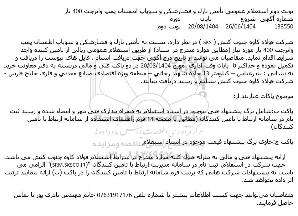 شرکت فولاد کاوه جنوب کیش ( SKS ) در نظر دارد نسبت به تأمین نازل و فشار شکن و سوپاپ اطمینان پمپ واترجت 400 بار مورد نیاز (مطابق موارد مندرج در اسناد) از طریق استعلام عمومی ریالی از تامین کننده واجد شرایط اقدام نماید. متقاضیان میتوانند از تاریخ درج آگهی جهت دریافت اسناد ، فایلهای پیوست را دریافت و تکمیل نموده و حداکثر تا پایان وقت اداری مورخ 1404.8.20 در دو پاکت فنی و مالی دربسته به دفتر معاونت خرید به نشانی : بندرعباس - کیلومتر 13 جاده شهید رجائي - منطقه ویژه اقتصادی صنایع معدنی و فلزی خلیج فارس -شرکت فولاد کاوه جنوب کیش تسلیم و رسید دریافت نمایند.