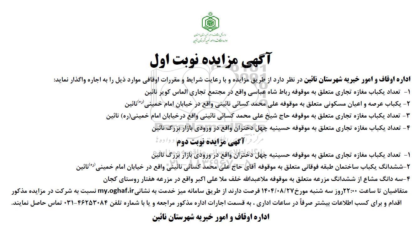 اداره اوقاف و امور خیریه شهرستان نائین در نظر دارد از طریق مزایده و با رعایت شرایط و مقررات اوقافی موارد ذیل را به اجاره واگذار نماید