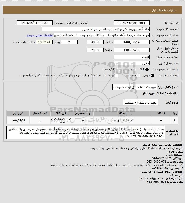 استعلام بها و موضوع استعلام استعلام رزرور بگ اطفال طبق لیست پیوست به اطلاع کلیه شرکتها و افراد متخصص واجد شرایط میرساند، آگهی گذار در نظر دارد از طریق استعلام بها، نسبت به انتخاب و دریافت پیشنهادات اقدام نماید. این استعلام با کد آگهی ثبت شده در سامانه خبرگزاری پارس نماد : 9787939 منتشر شده است. مشخصات استعلام : تاریخ شروع استعلام: 1404/08/11 آخرین مهلت ارسال پیشنهاد قیمت : 1404/08/14 و محل اجرای پروژه : استان فارس میباشد. استعلام قیمت مورد درخواست : استعلام رزرور بگ اطفال طبق لیست پیوست با دستهبندیهای تخصصی و گروه های مرتبط : خدمات و تجهیزات آزمایشگاهی و پزشکی, استعلام اطلاع رسانی میگردد.
