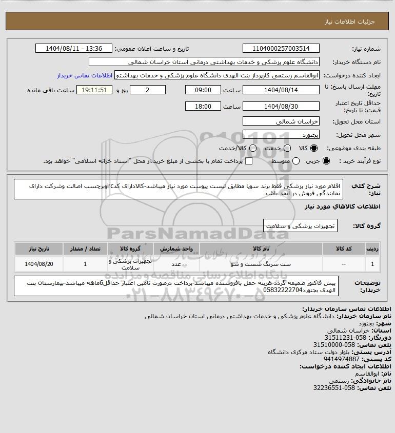 نام دستگاه خریدار:دانشگاه علوم پزشکی و خدمات بهداشتی درمانی استان خراسان شمالی