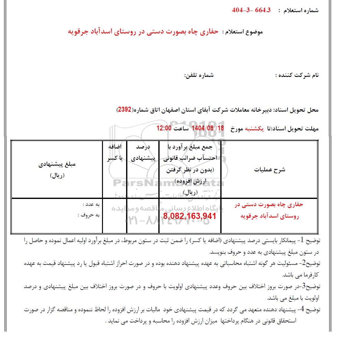موضوع استعلام: حفاری چاه به صورت دستی در روستای اسدآباد جرقویه