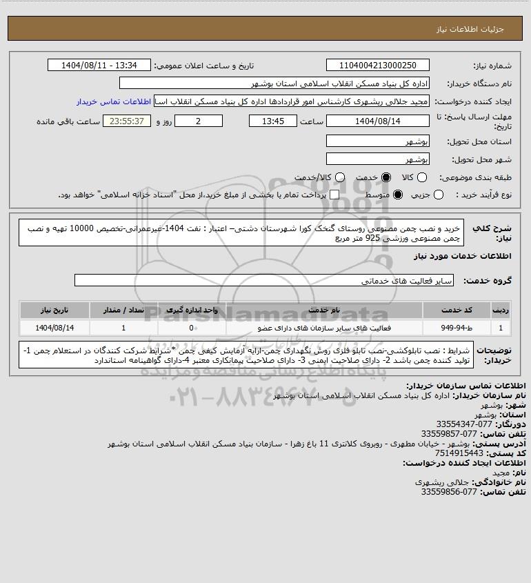 شرح کلی نیاز: خرید و نصب چمن مصنوعی روستای گنخک کورا شهرستان دشتی– اعتبار : نفت 1404-غیرعمرانی-تخصیص 10000