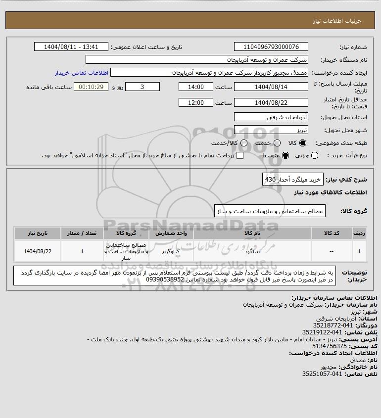| 1 | -- | میلگرد | کیلوگرم | مصالح ساختمانی و ملزومات ساخت و ساز | 1 | 1404/08/22 |