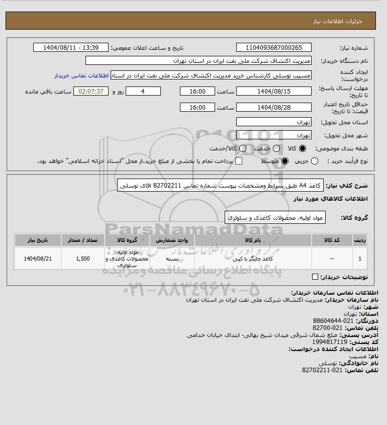 شرح کلی نیاز: کاغذ A4 طبق شرایط ومشخصات پیوست شماره تماس 82702211 اقای توسلی