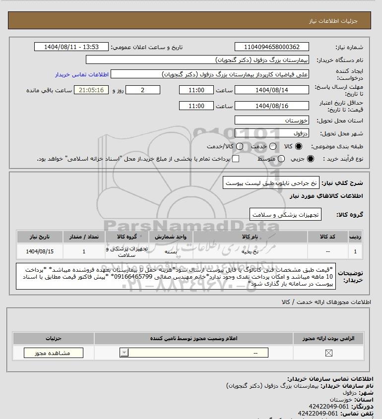 نام سازمان خریدار: بیمارستان بزرگ دزفول (دکتر گنجویان)