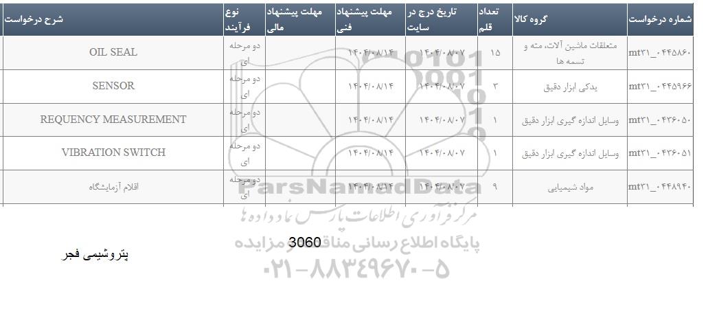 | mt31-0436050 | وسایل اندازه گیری ابزار دقیق | 1 | 1404.08.07 | 1404.08.14 | دو مرحله ای | REQUENCY MEASUREMENT |