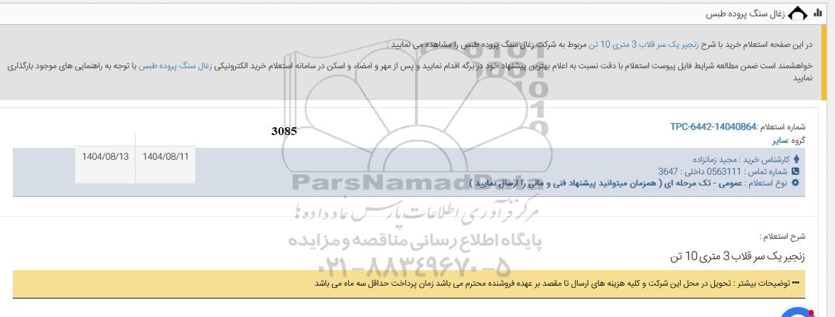 در این صفحه استعلام خرید با شرح زنجیر یک سر قلاب 3 متری 10 تن مربوط به شرکت زغال سنگ پروده طبس را مشاهده می نمایید.