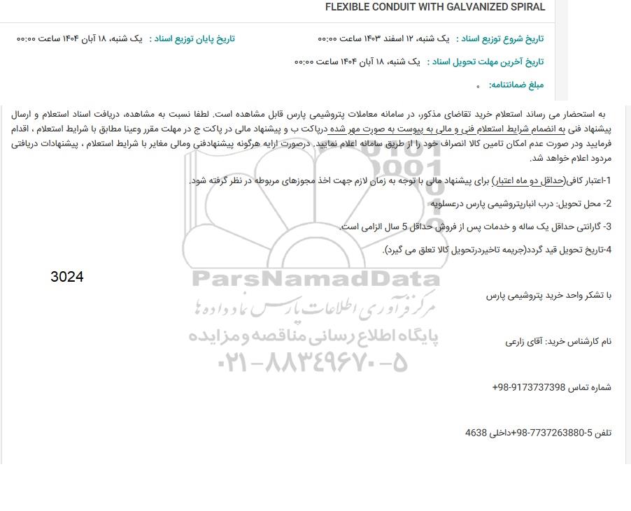 استعلام بها و موضوع استعلام استعلام FLEXIBLE CONDUIT WITH GALVANIZED SPIRAL به اطلاع کلیه شرکتها و افراد متخصص واجد شرایط میرساند، آگهی گذار در نظر دارد از طریق استعلام بها، نسبت به انتخاب و دریافت پیشنهادات اقدام نماید. این استعلام با کد آگهی ثبت شده در سامانه خبرگزاری پارس نماد : 9788129 منتشر شده است. مشخصات استعلام : تاریخ شروع استعلام: 1404/08/11 آخرین مهلت ارسال پیشنهاد قیمت : 1404/08/18 و محل اجرای پروژه : استان بوشهر میباشد. استعلام قیمت مورد درخواست : استعلام FLEXIBLE CONDUIT WITH GALVANIZED SPIRAL با دستهبندیهای تخصصی و گروه های مرتبط : گالوانیزه, سینی و نردبان کابل, لوله و اتصالات, تجهیزات برق و الکترونیک, استعلام اطلاع رسانی میگردد.