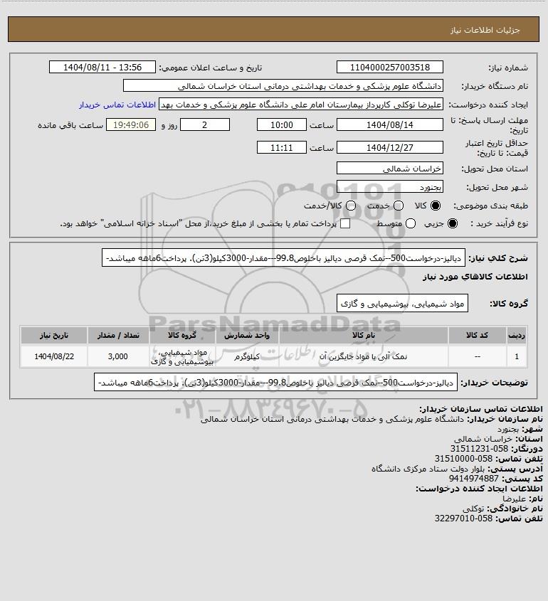 شرح کلی نیاز: دیالیز-درخواست500--نمک قرصی دیالیز باخلوص99.8---مقدار-3000کیلو(3تن). پرداخت6ماهه میباشد-
