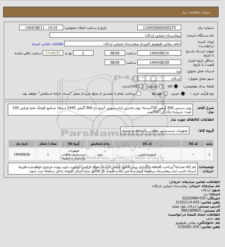 شرح کلی نیاز: پودر دستی 500 گرمی 720بسته- پودر ماشین لباسشویی آنزیم دار 500 گرمی 1440 بسته- شامپو کوچک تخم مرغی 100 عدد- شیشه پاک کن 500عدد