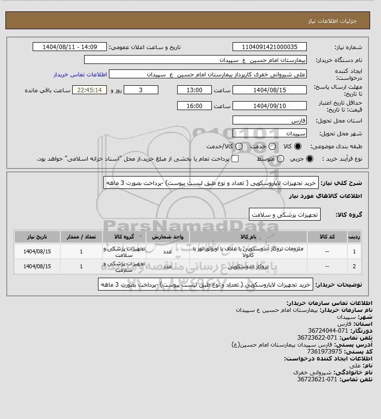 استعلام بها و موضوع استعلام استعلام خرید تجهیزات لاپاروسکوپی ( تعداد و نوع طبق لیست پیوست) -پرداخت بصورت 3 ماهه به اطلاع کلیه شرکتها و افراد متخصص واجد شرایط میرساند، آگهی گذار در نظر دارد از طریق استعلام بها، نسبت به انتخاب و دریافت پیشنهادات اقدام نماید. این استعلام با کد آگهی ثبت شده در سامانه خبرگزاری پارس نماد : 9788188 منتشر شده است. مشخصات استعلام : تاریخ شروع استعلام: 1404/08/11 آخرین مهلت ارسال پیشنهاد قیمت : 1404/08/15 و محل اجرای پروژه : استان فارس میباشد. استعلام قیمت مورد درخواست : استعلام خرید تجهیزات لاپاروسکوپی ( تعداد و نوع طبق لیست پیوست) -پرداخت بصورت 3 ماهه با دستهبندیهای تخصصی و گروه های مرتبط : خدمات و تجهیزات آزمایشگاهی و پزشکی, استعلام اطلاع رسانی میگردد.