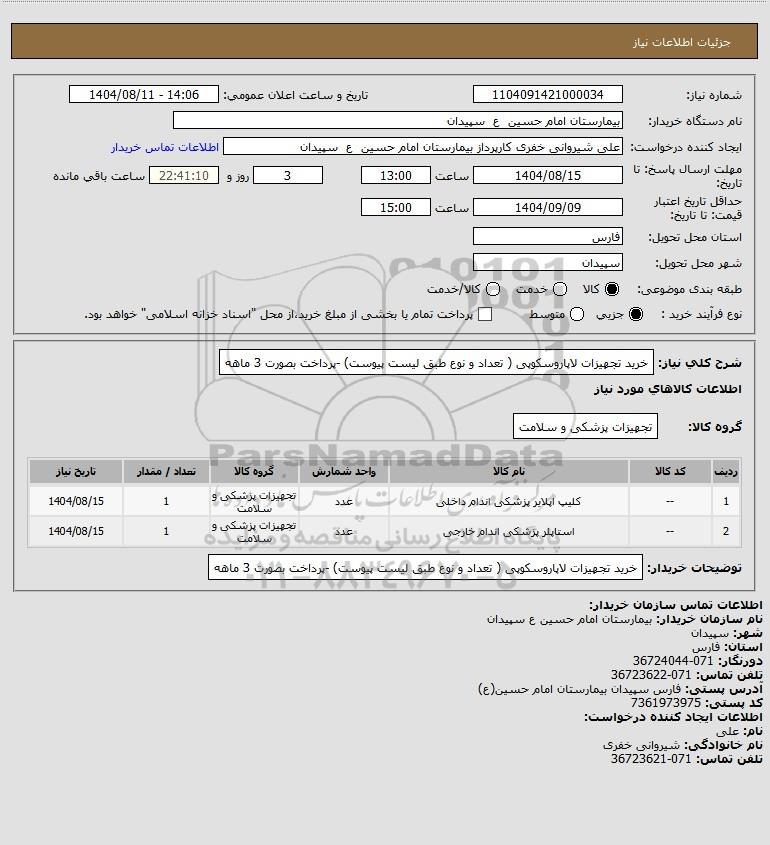 توضیحات خریدار:خرید تجهیزات لاپاروسکوپی ( تعداد و نوع طبق لیست پیوست) -پرداخت بصورت 3 ماهه