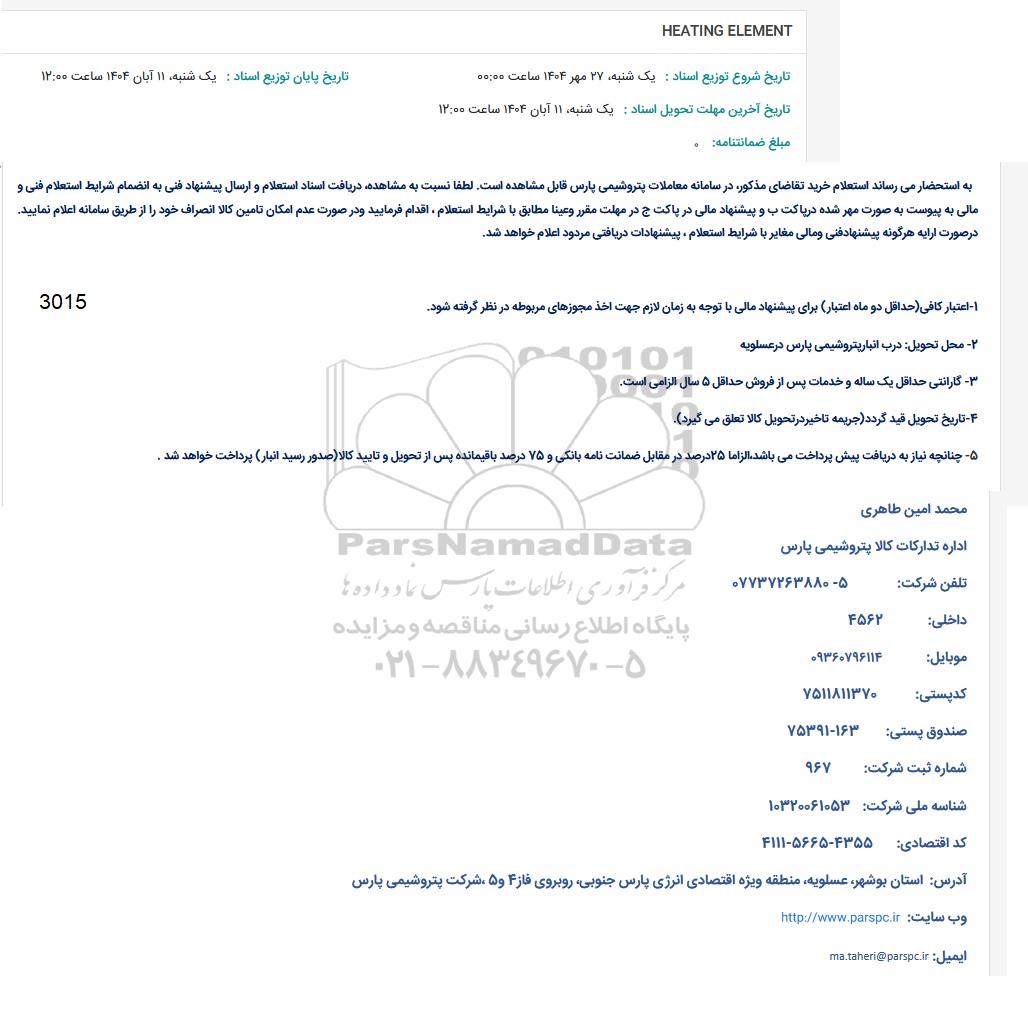 استعلام بها و موضوع استعلام استعلام HEATING ELEMENT به اطلاع کلیه شرکتها و افراد متخصص واجد شرایط میرساند، آگهی گذار در نظر دارد از طریق استعلام بها، نسبت به انتخاب و دریافت پیشنهادات اقدام نماید. این استعلام با کد آگهی ثبت شده در سامانه خبرگزاری پارس نماد : 9788231 منتشر شده است. مشخصات استعلام : تاریخ شروع استعلام: 1404/08/11 آخرین مهلت ارسال پیشنهاد قیمت : 1404/08/11 و محل اجرای پروژه : استان بوشهر میباشد. استعلام قیمت مورد درخواست : استعلام HEATING ELEMENT با دستهبندیهای تخصصی و گروه های مرتبط : انواع توربین های بادی و آبی و غیره, نیروگاه, تجهیزات نفت و گاز, تجهیزات برق و الکترونیک, استعلام اطلاع رسانی میگردد. شرایط شرکت در استعلام آنلاین : ابتدا ثبت نام در سامانه استعلام پارس نماد و تکمیل مدارک موردنیاز و بارگذاری در سامانه رعایت تمامی ضوابط و الزامات مندرج در اسناد استعلام است.